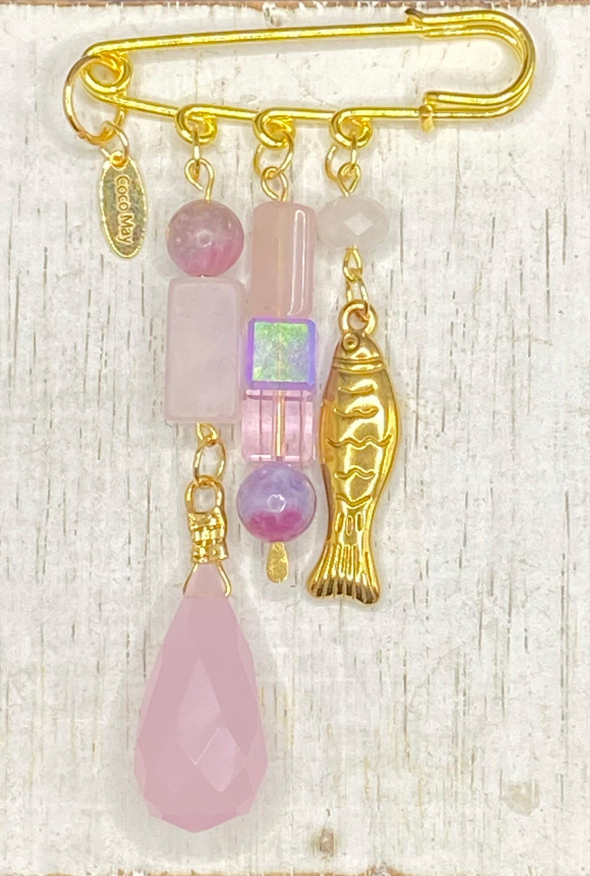 - 18K gold plated jewelry-specific safety pin, rose quartz gemstones in various shapes and sizes, tourmaline, lepidolite, Madagascar rose quartz, Swarovski crystal, 18K gold-plated fish charm.
