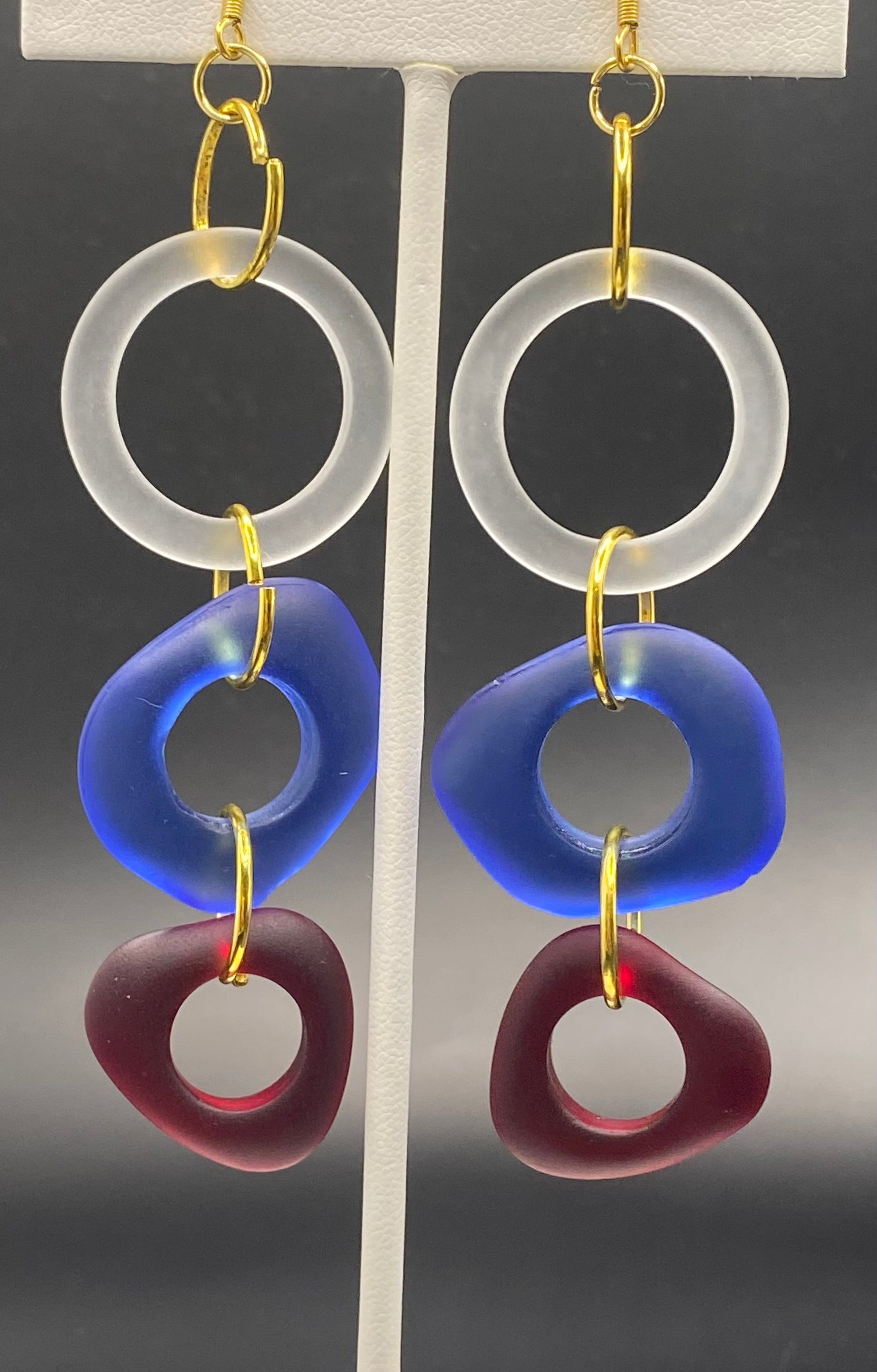 There you are: seaside, sipping on a chilly flute of prosecco, gazing out at all those shades of blue. You're not just beautiful, you're happy, really happy. And the earrings that flow from white to blue to red reflect your confidence, your joie de vivre. Life at teh ocean is good. Recycled materials for the love of Mother Earth.