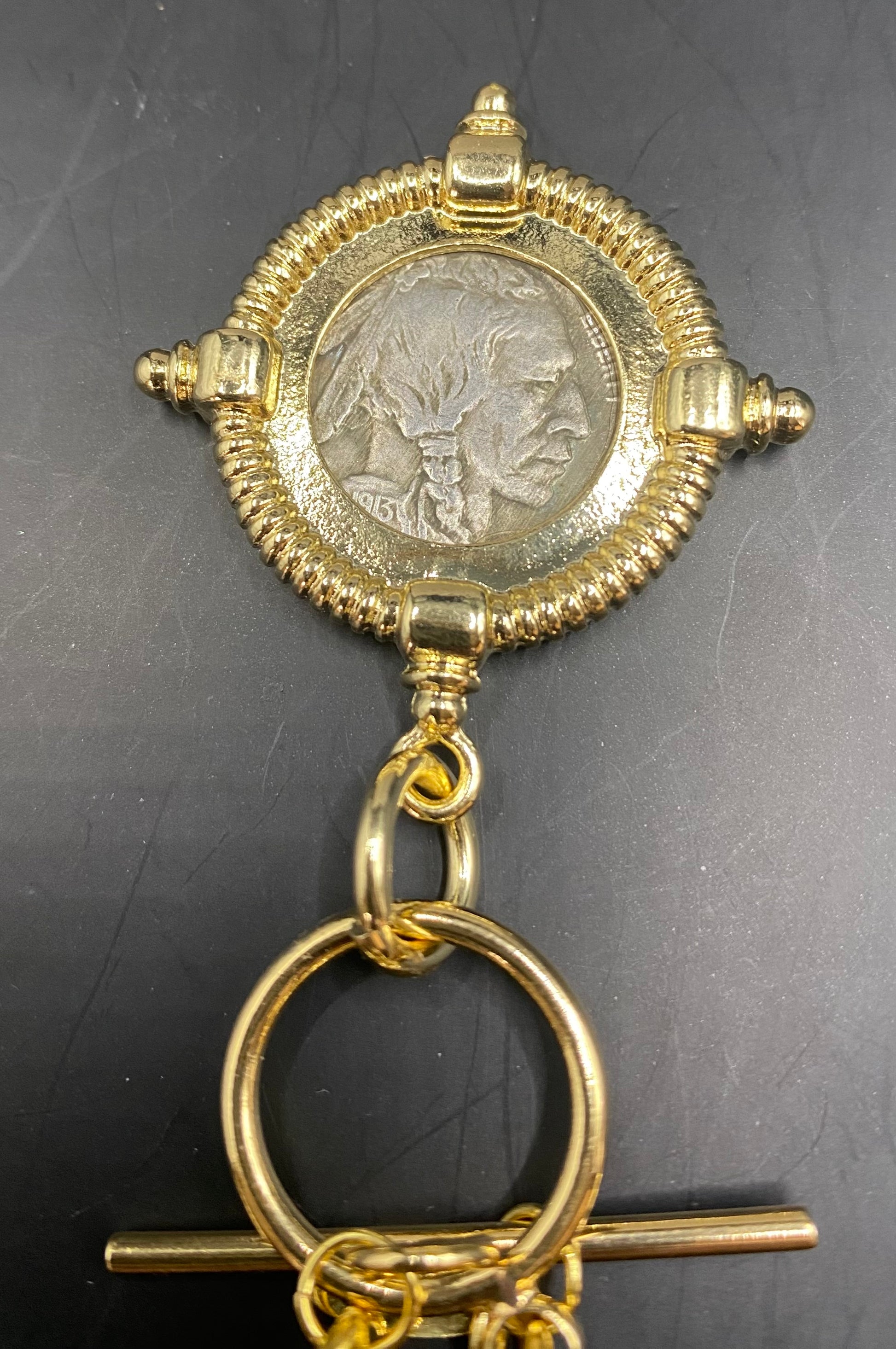 An homage to the wild west, this faithfully reproduced buffalo nickel is set in a stunning open gold frame so that both sides of this historic nickel are visible. A statement piece you will love!