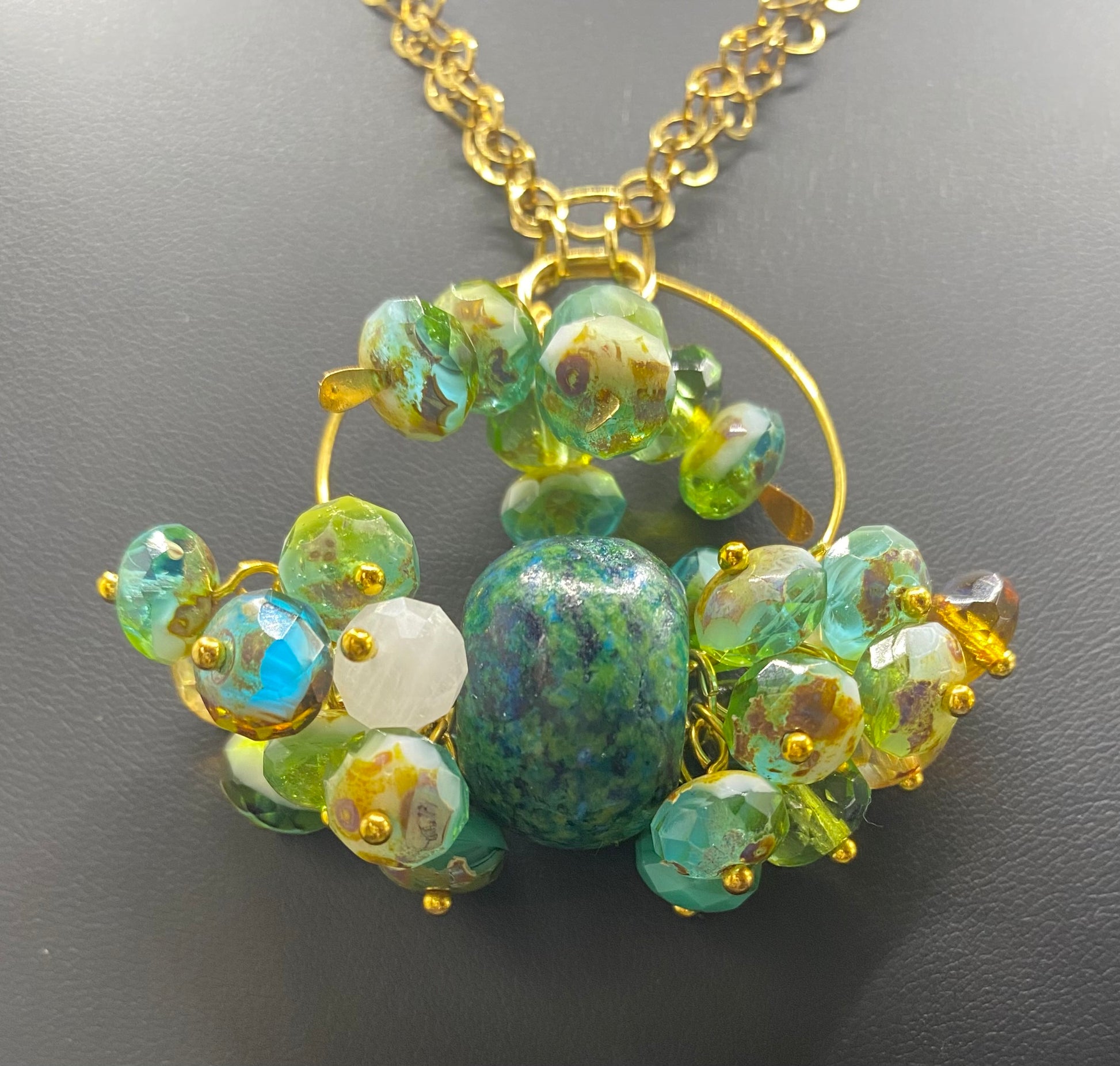 What a glorious necklace! Celebration features a large African yellow turquoise stone surrounded by a joyful explosion of sea-and-sky inspired faceted, fire-polished Czech crystal and amazonite beads on a gold double chain. African yellow turquoise is said to open the third eye chakra, leading to deepened self-awareness, courage, wisdom, and inner peace. This piece head-turner pairs beautifully with our CELEBRATION SEA FOAM: CZECH CRYSTAL AND GOLD EARRINGS, the ONEIDA CELEBRATION BRACELET, and the CELEBRATION IN BLUE bracelet.