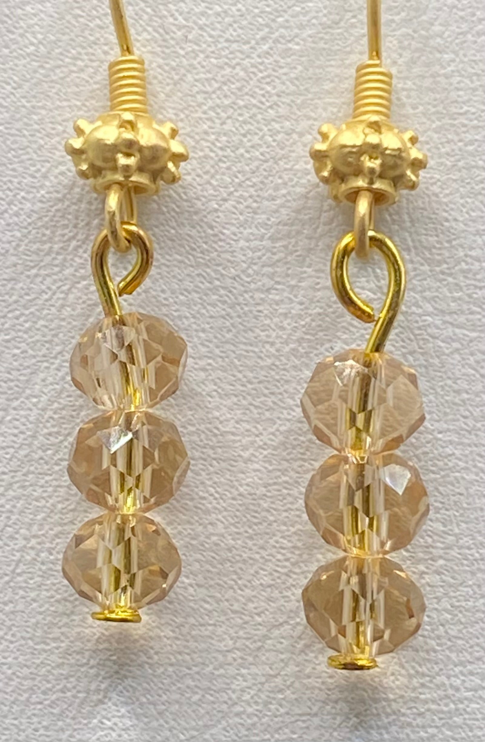 Three stacked faceted champagne Czech crystal beads shine like a field of stars dangling from satin gold earwires. The champagne stones are rumored to promote joy and celebration. Imagine: a starry, starry night.