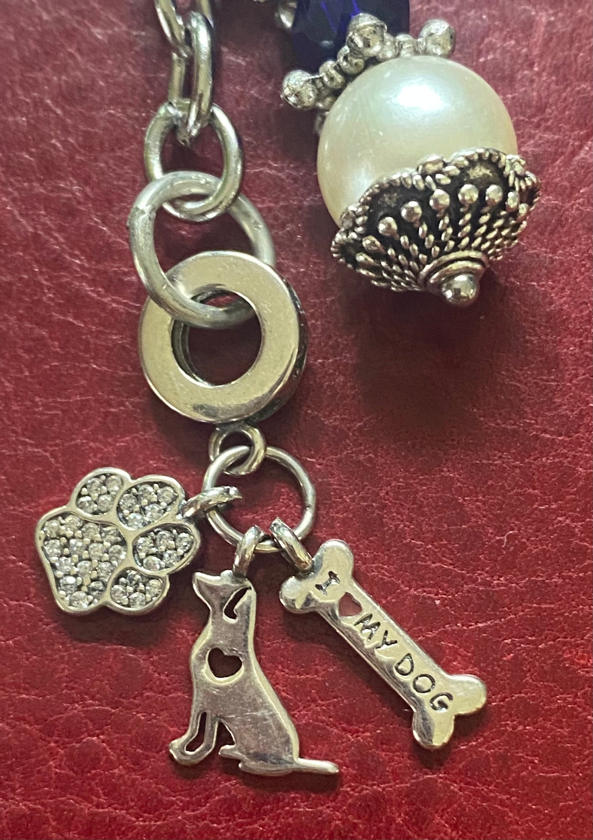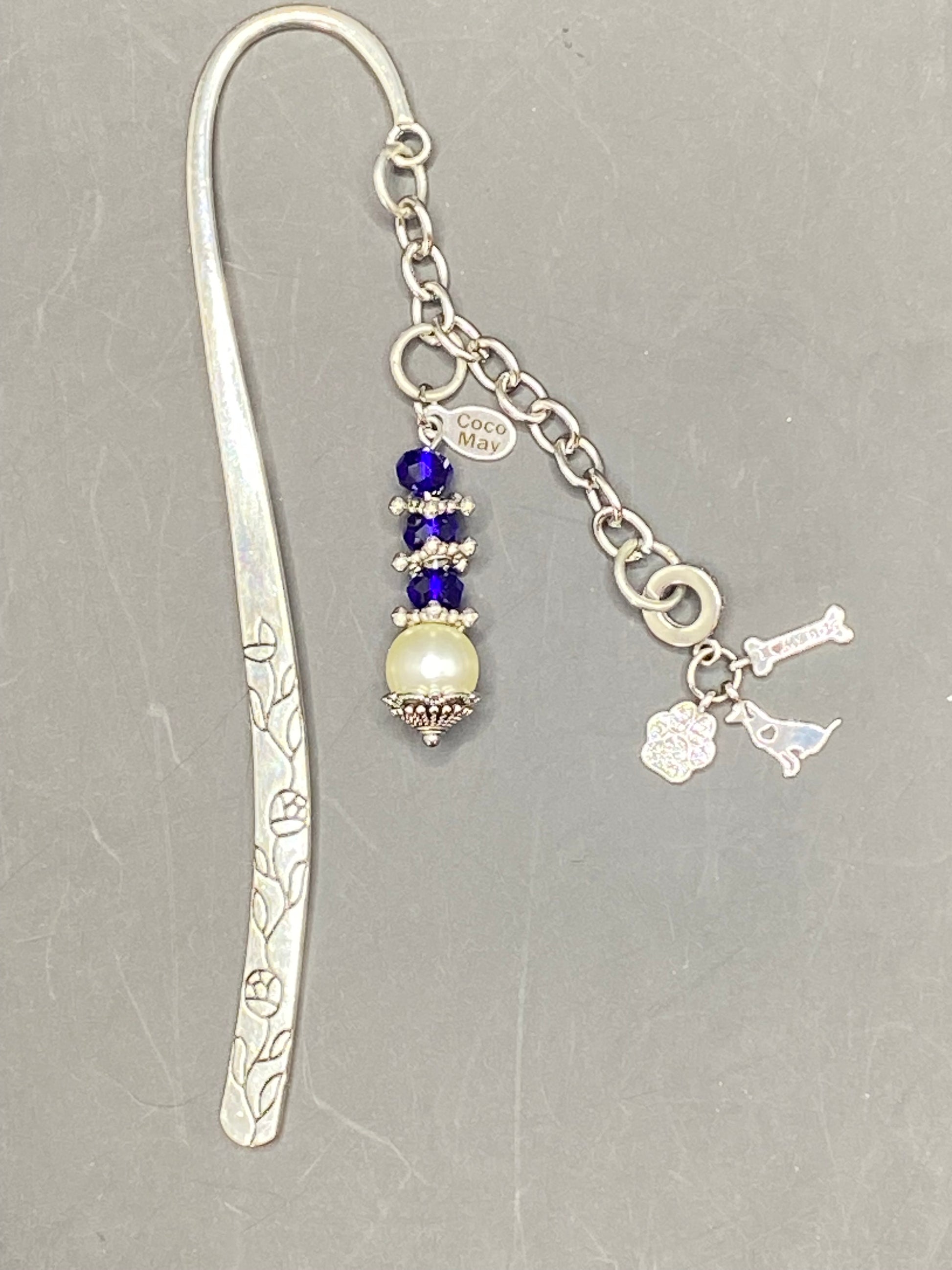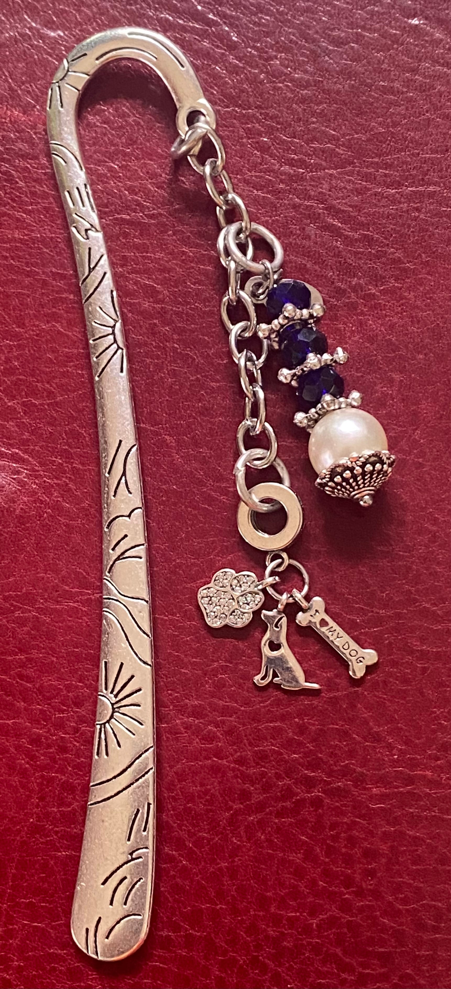 For the book and dog lover, this beautiful bookmark features sterling silver canine-themed charms: sitting like a good pup enameled dog with a heart, a dog bone, and a pavé cubic zirconia dog paw. Three stacked Czech cobalt crystals and a pearl watch over our sweet dog.