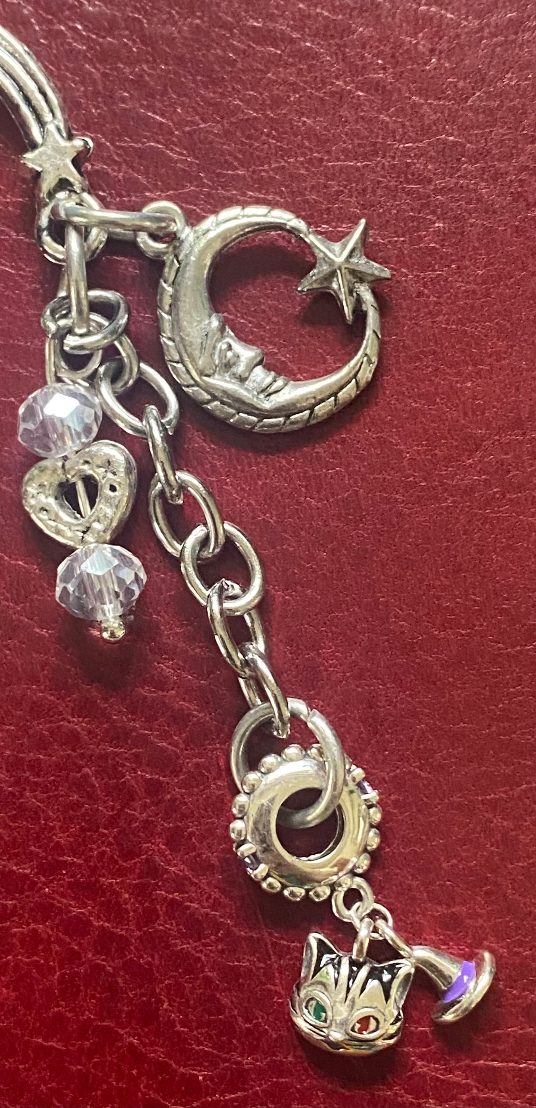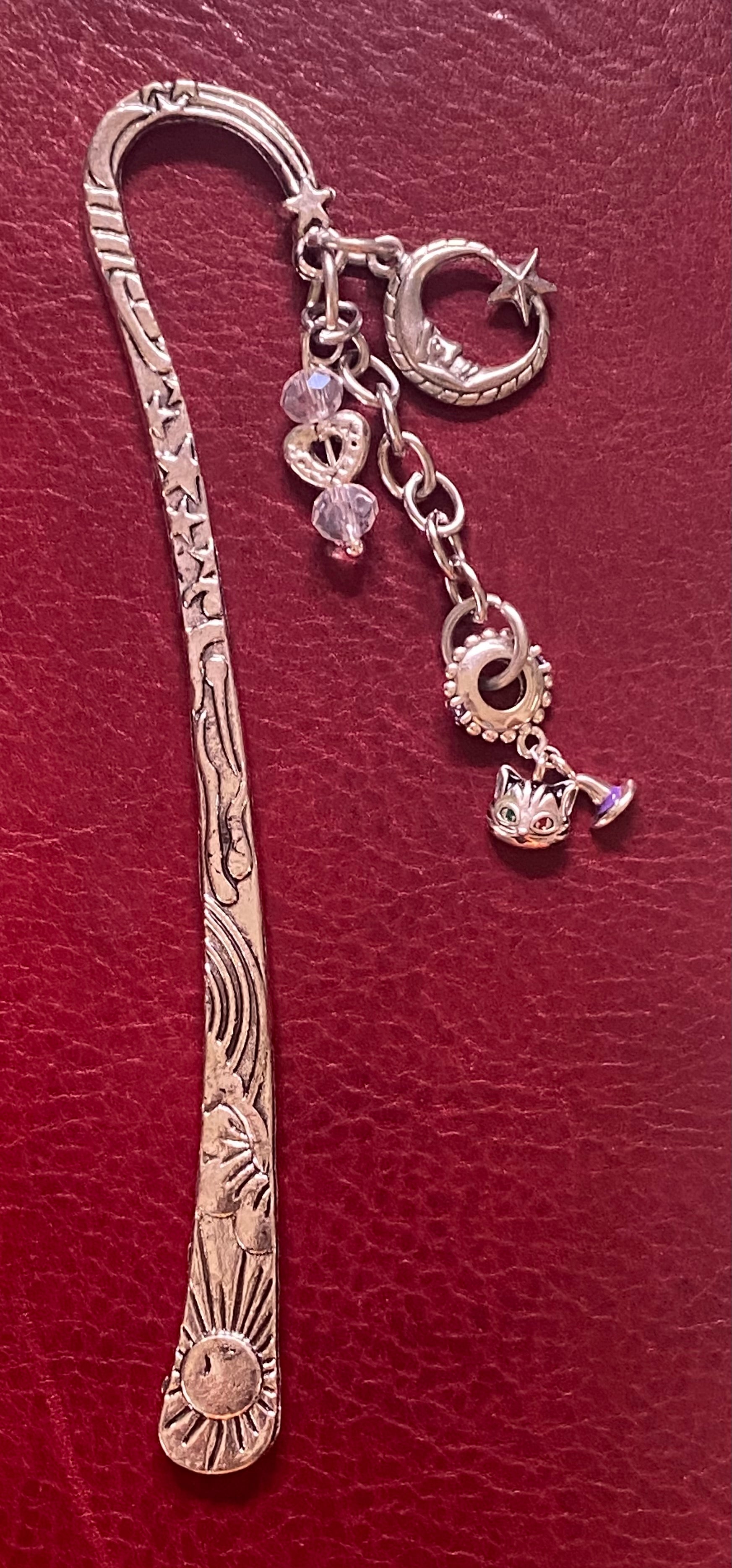 For the book and cat lover, this beautiful bookmark features incredibly intricate sterling silver charms: an enameled magic cat with one green eye and one red eye, a magic hat with a purple band. Hanging over our magic cat is a crescent moon with a star and a heart charm bookended by two Czech faceted crystals. This bookmark is sure to cast spells time and again.