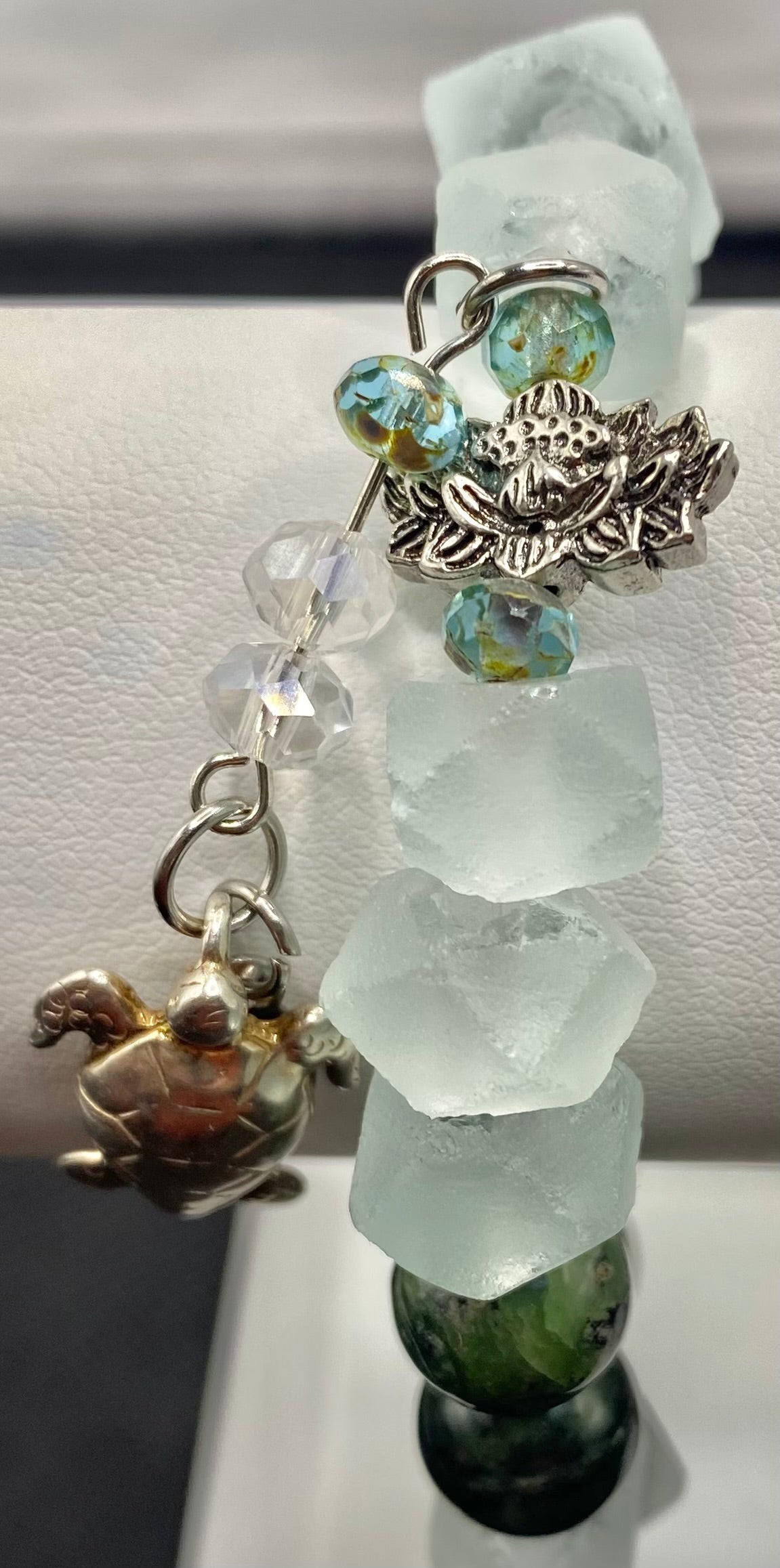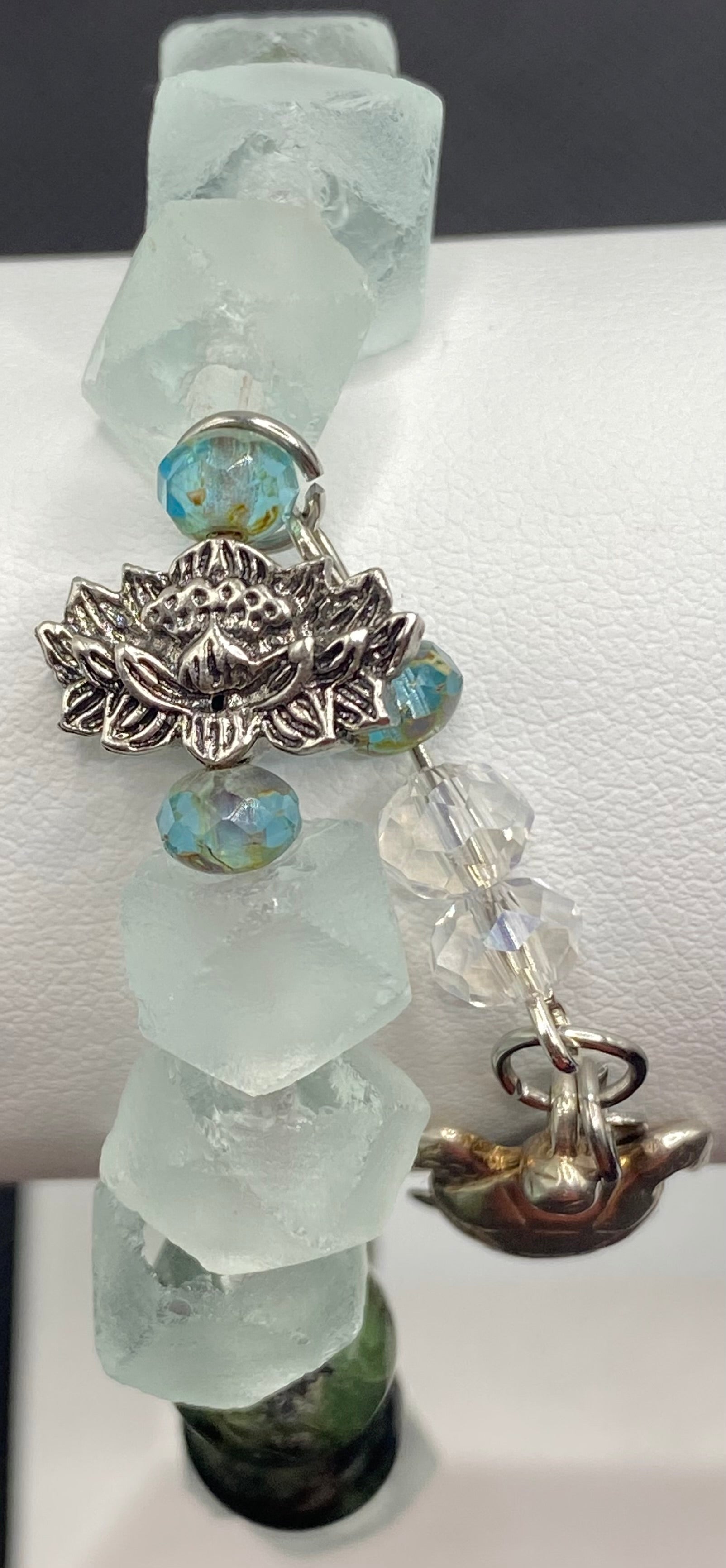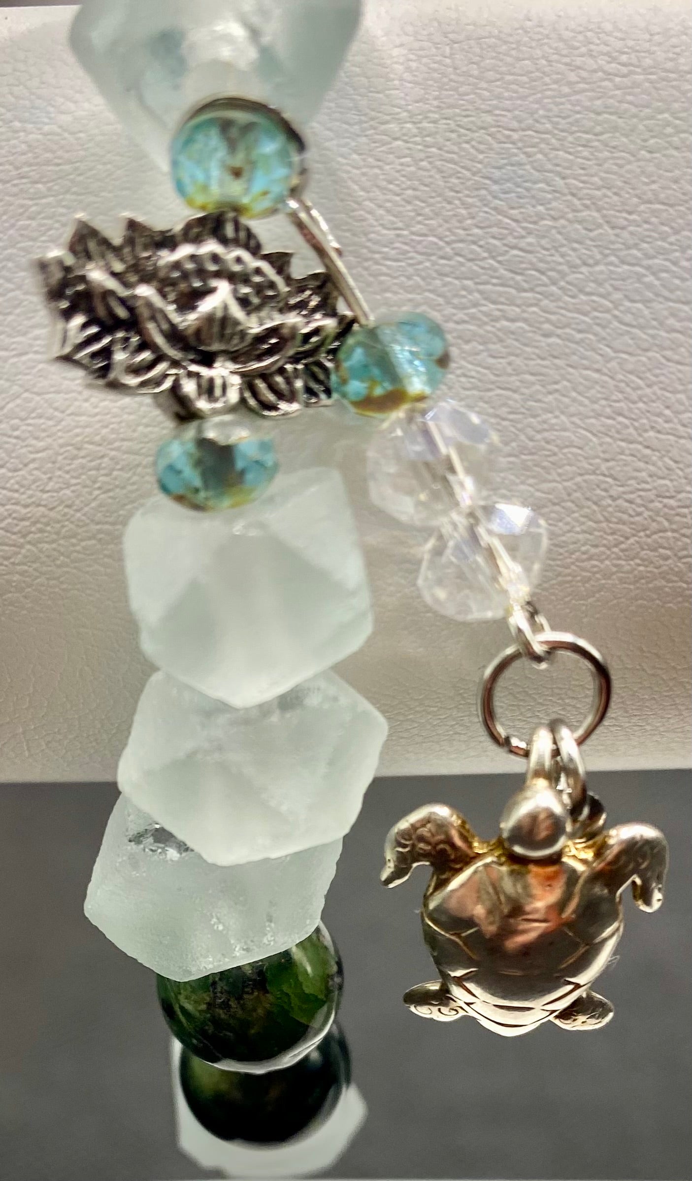 KATH LIVES IN A FOREST IN THE SEA bracelet combines the moss and fern patterns of dendritic jade with the cool pale blue of Java sea glass. A sterling silver turtle is suspended from a silver lotus blossom all accented with Czech, fire-polished aquamarine crystals and clear crystals. Jade is said to bring the wearer prosperity, wisdom, and longevity. We suspect this bracelet might endow its wearer with good magic. Strung on the strongest jewelry grade material available, it is double knotted with a dab of jeweler's glue, providing strength and durability.