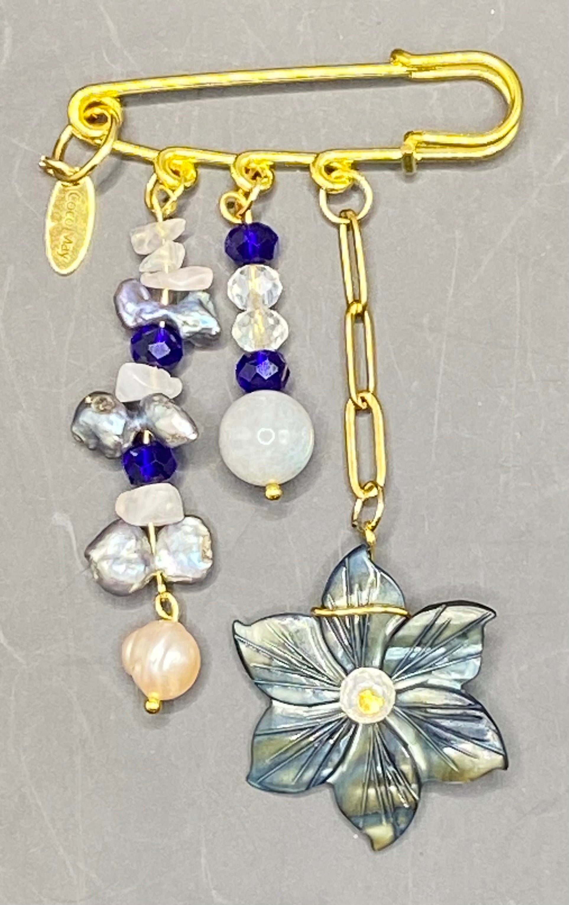 Evoking the many moods of the sea, PEARL AND THE GREAT BLUE SEA BROOCH features a large mother of pearl flower centered with a faceted Czech crystal stone, peacock mother of pearl beads, a baroque pearl, a trolleite bead, faceted clear and cobalt Czech crystal beads, all of it adorning a heavy, gold-plated, jewelry-specific safety pin. This brooch is not meant to be worn with thin fabrics, but is a gorgeous statement piece you can add to coats, blazers, jackets, hats, purses, and anything else made of sturdy material.