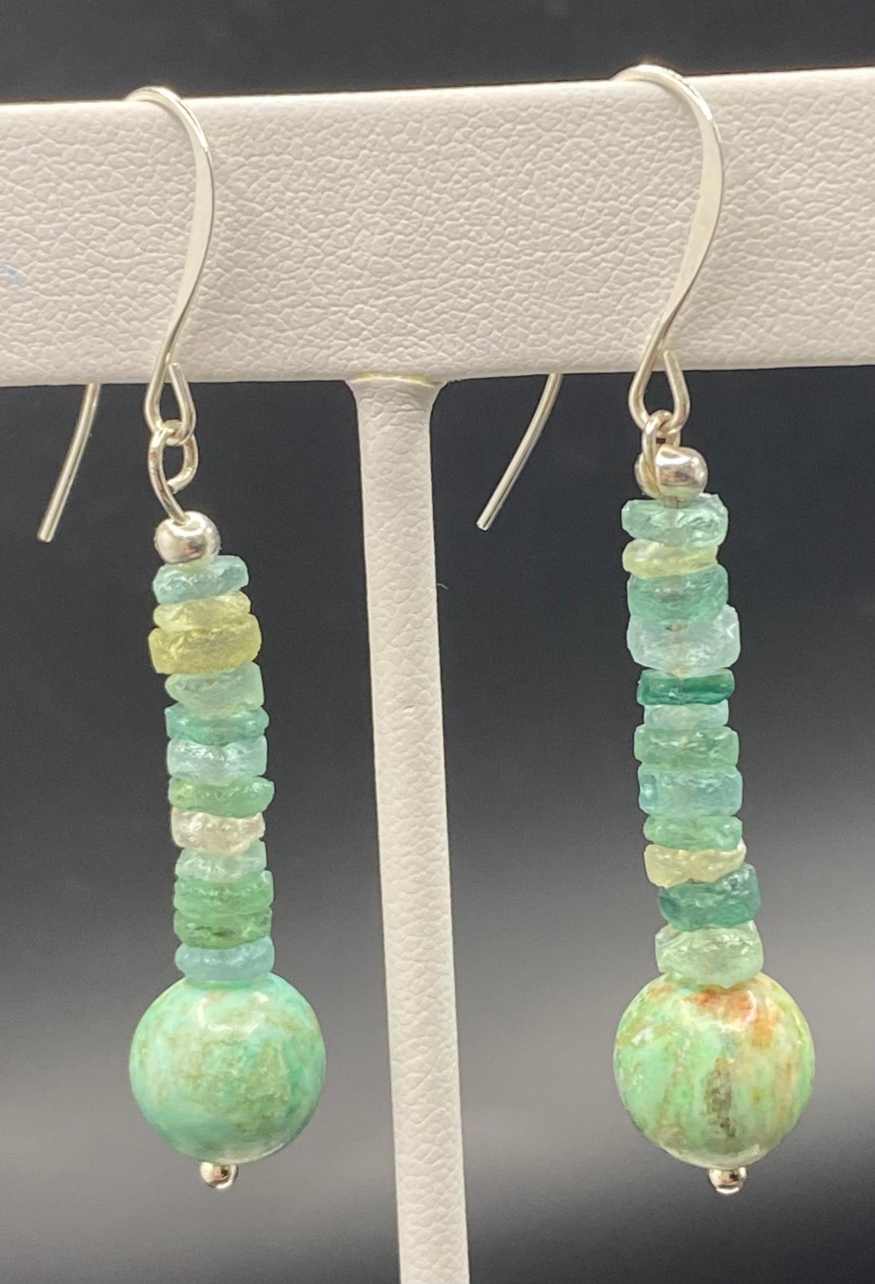 Peruvian turquoise beads are crowned with twelve (a sacred number, yes?) ancient Roman heishi glass beads. These sophisticated, earthy yet elegant earrings will be your go-to accessory on days your spirit soars or needs a lift. The Inca used Peruvian turquoise in their ceremonial dress, connecting their prayers and desires to the earthly and divine realms.