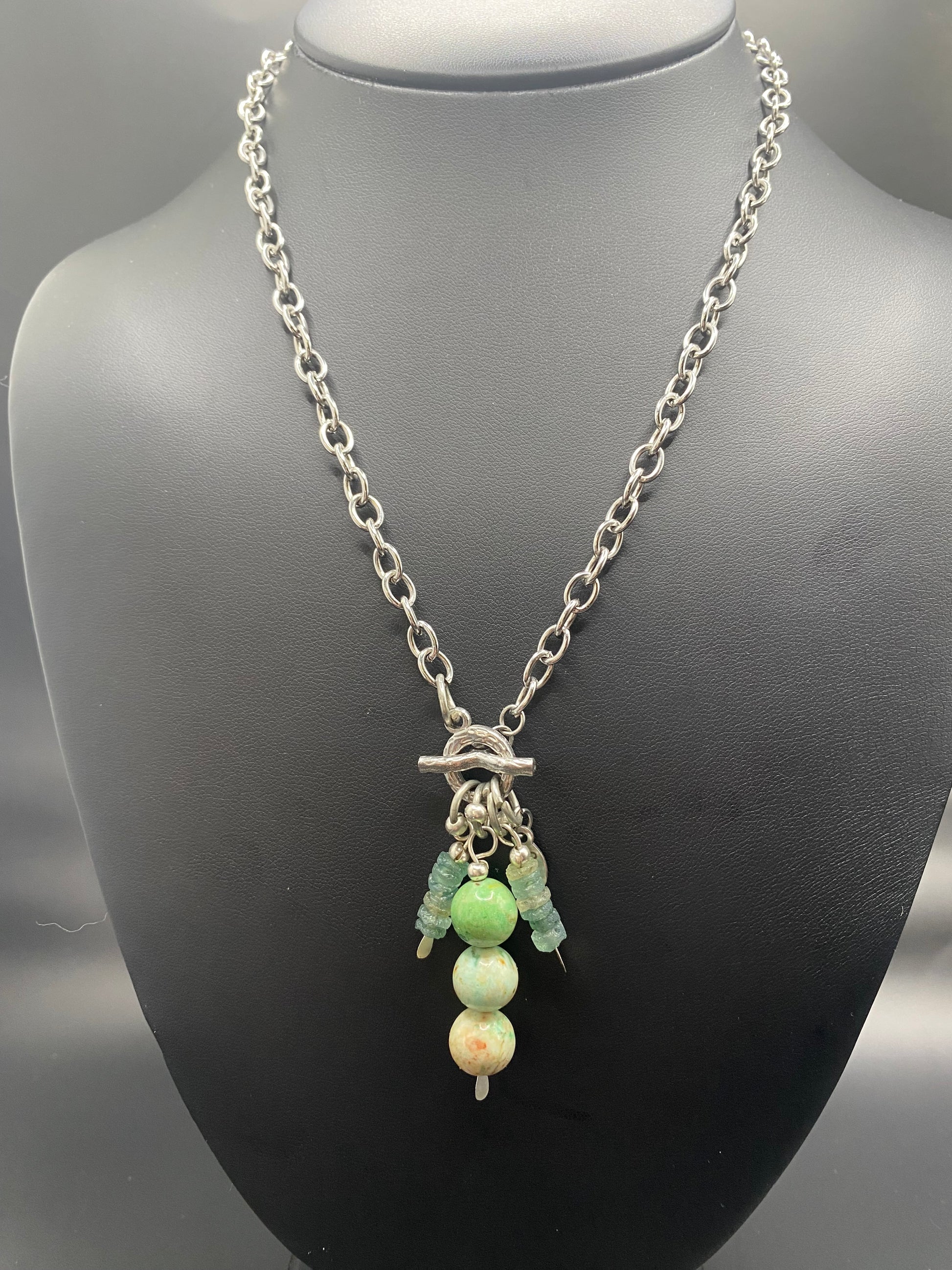 This gorgeous charm necklace offers a magical blend of Peruvian turquoise beads and ancient Roman heishi glass beads. This sophisticated, earthy yet elegant necklace will be your go-to accessory on days your spirit soars or needs a lift. The Inca used Peruvian turquoise in their ceremonial dress, connecting their prayers and desires to the earthly and divine realms. Pairs perfectly with our PERUVIAN QUEEN EARRINGS.