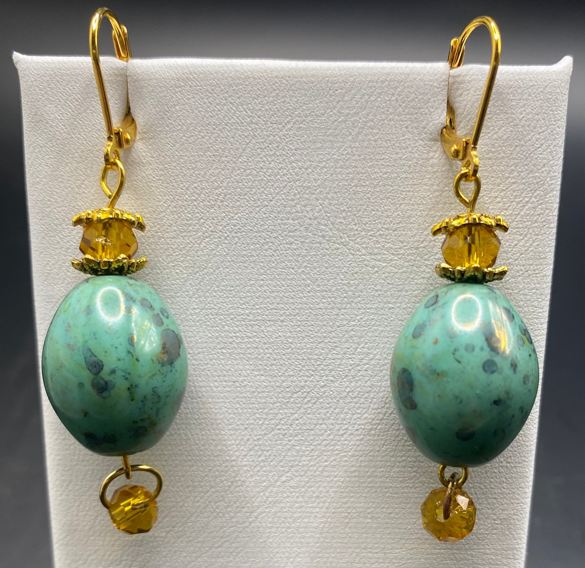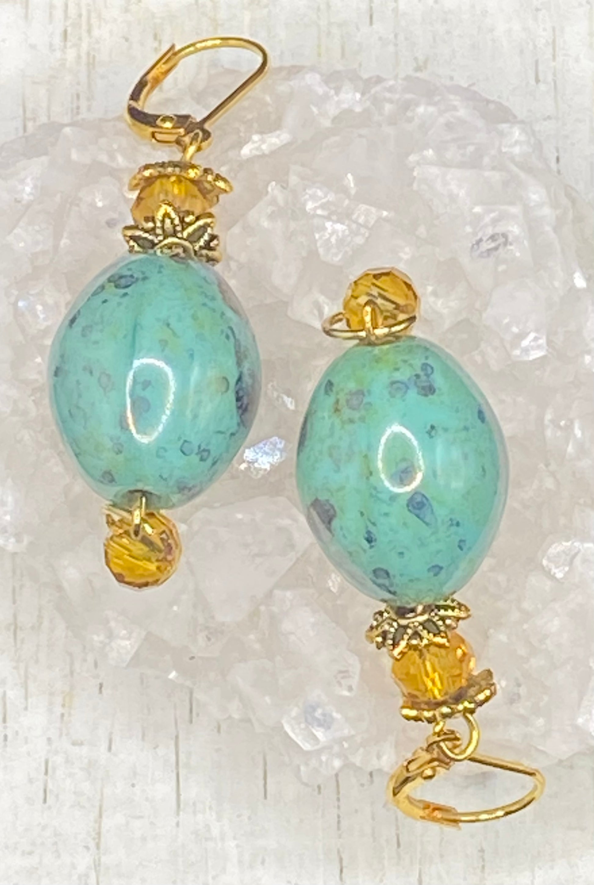 Named after its stone's color--blended turquoise and aqua Picasso--these gorgeous oval beads are made from premium Czech glass that is fire polished and crafted into oval cathedral beads. The Picasso bead is crowned on either end with a faceted Czech topaz crystal. These earrings have beautiful variations of color, just like the sea, the sky, your heart.