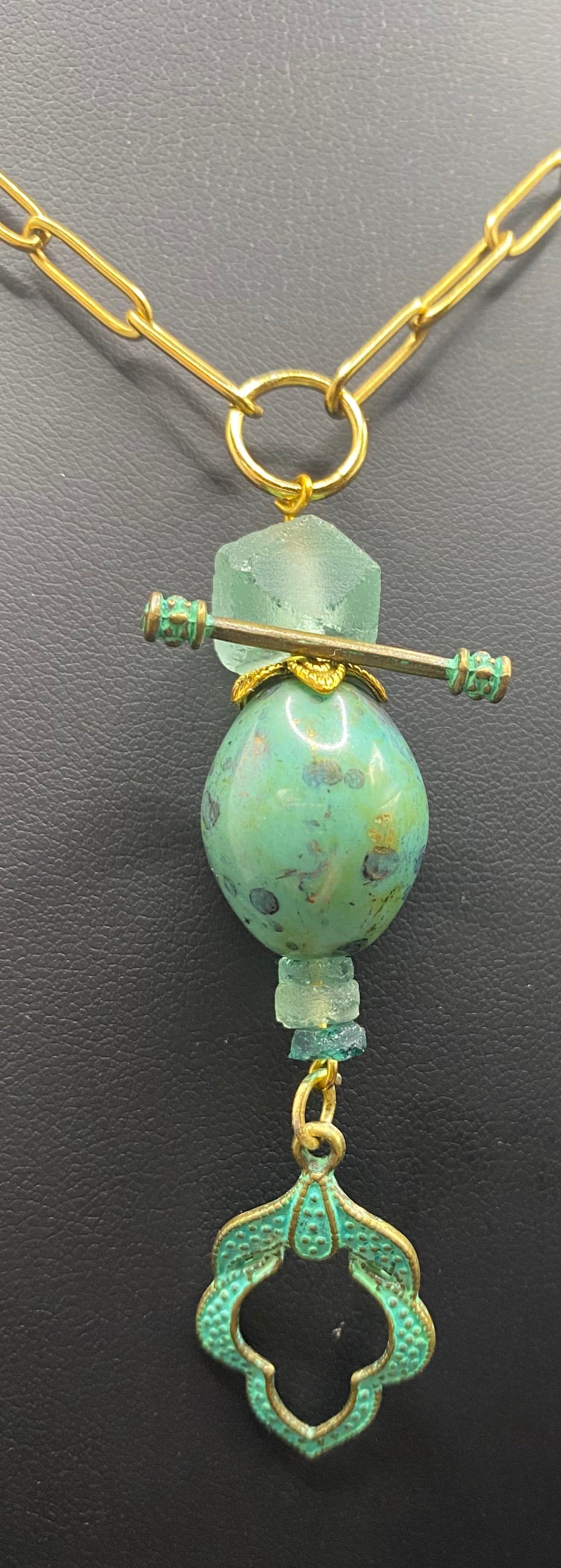 - 18k gold plated chain, Java beach glass, Czech cathedral bead, Roman heishi beads.