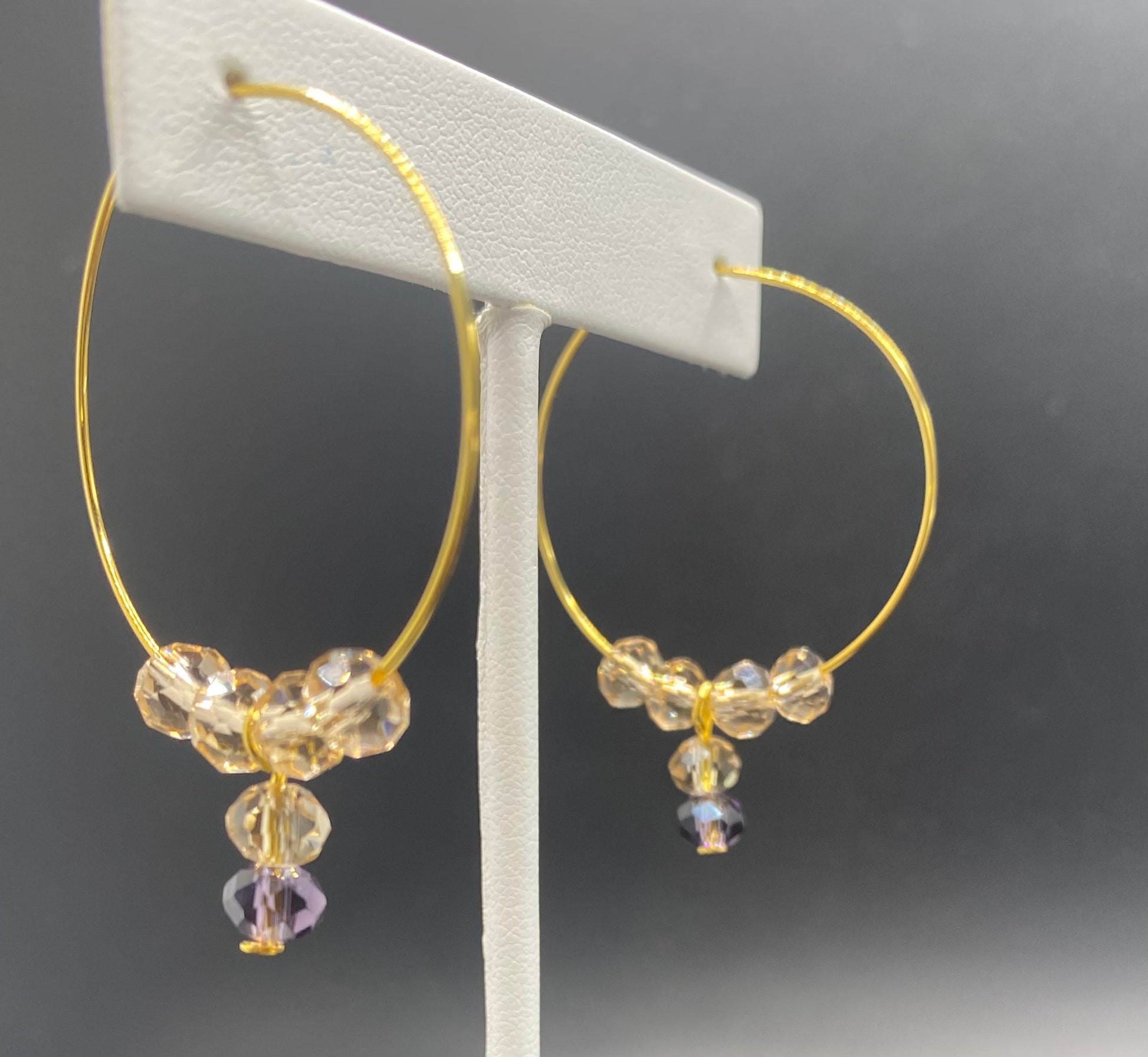 These golden hoops shine with casual elegance: five faceted Czech champagne crystal stones drop into a single faceted Czech amethyst crystal. The faceting enables dynamic light-play.