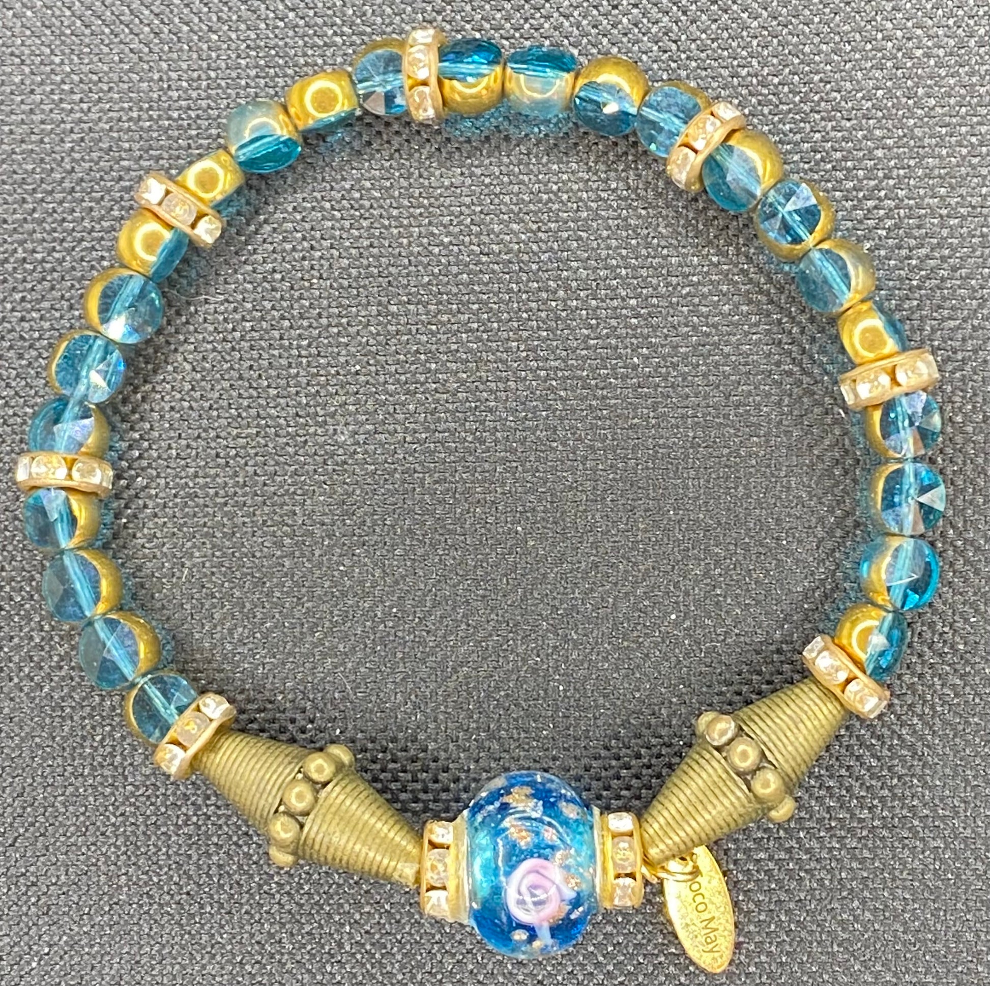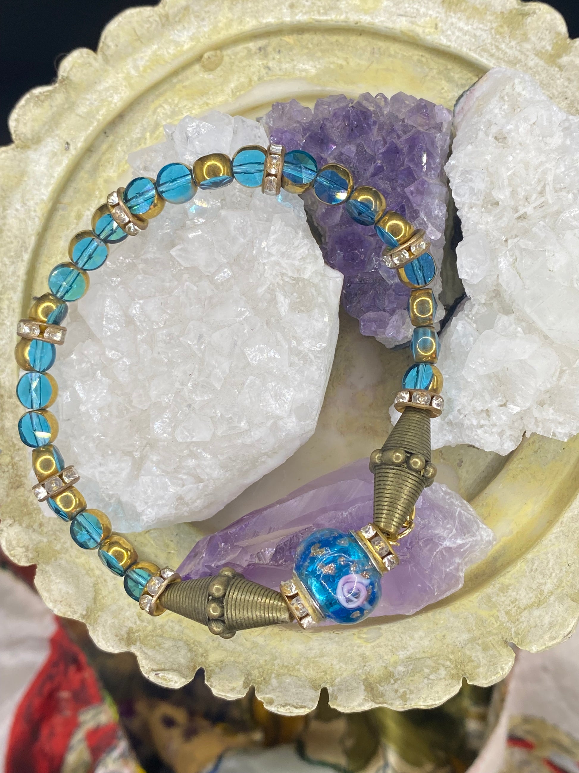 The SOLEDAD BRACELET bracelet is made of faceted aquamarine Czech crystals that are gold-leafed, an aquamarine Murano glass focal bead with flecks of gold and pink, crystal spacer beads, and antique bronze sculptural beads. The rich, light-reflecting blue and gold tones in this statement piece bring to mind ancient cities filled with love, history, and promise. Strung on the strongest jewelry grade material available, it is double knotted with a dab of jeweler's glue, providing strength and durability.