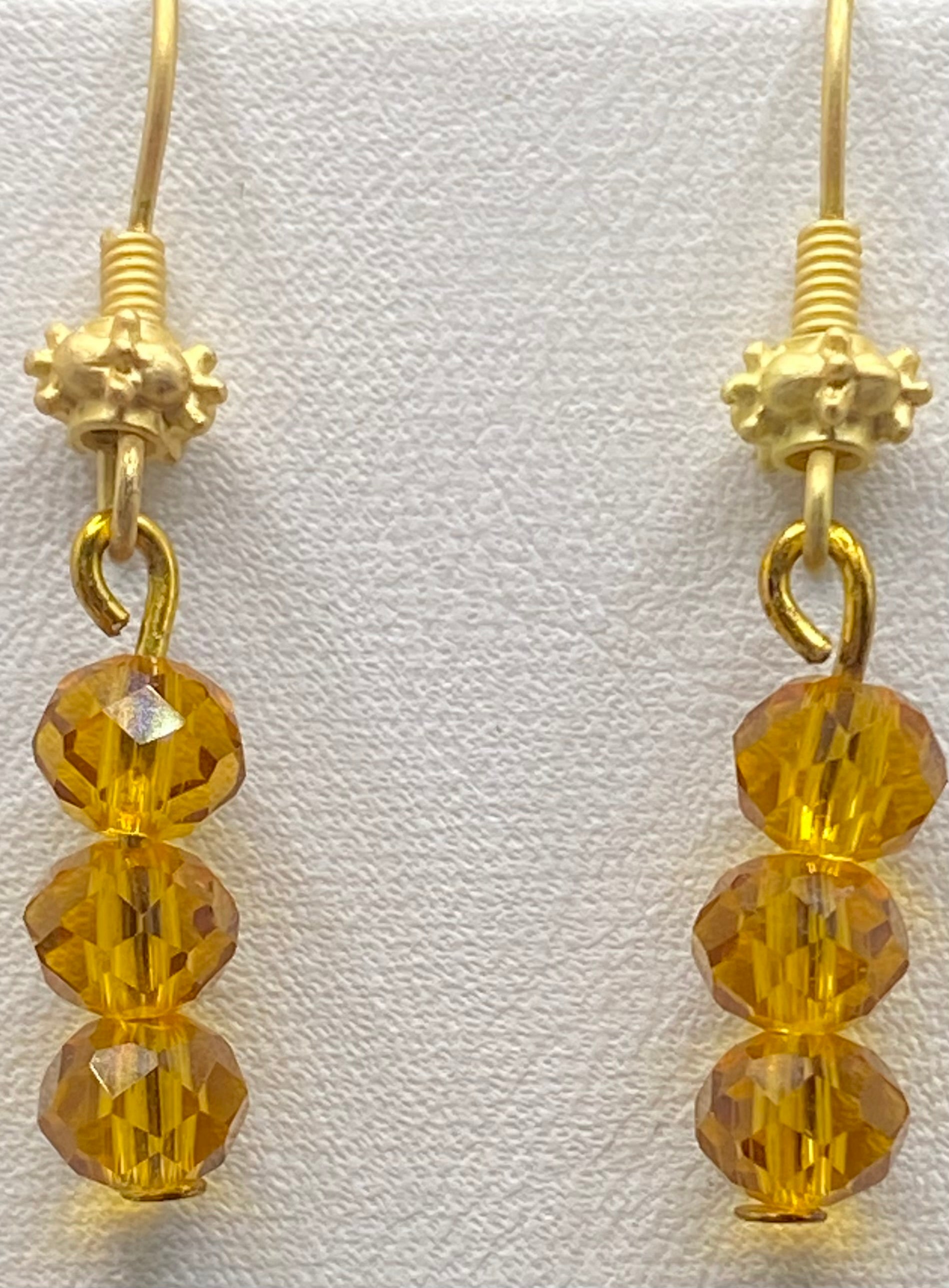 Three stacked faceted topaz Czech crystal beads shine like a field of stars dangling from satin gold earwires. The cobalt stones are rumored to promote abundance and joy. Imagine: a starry, starry night.