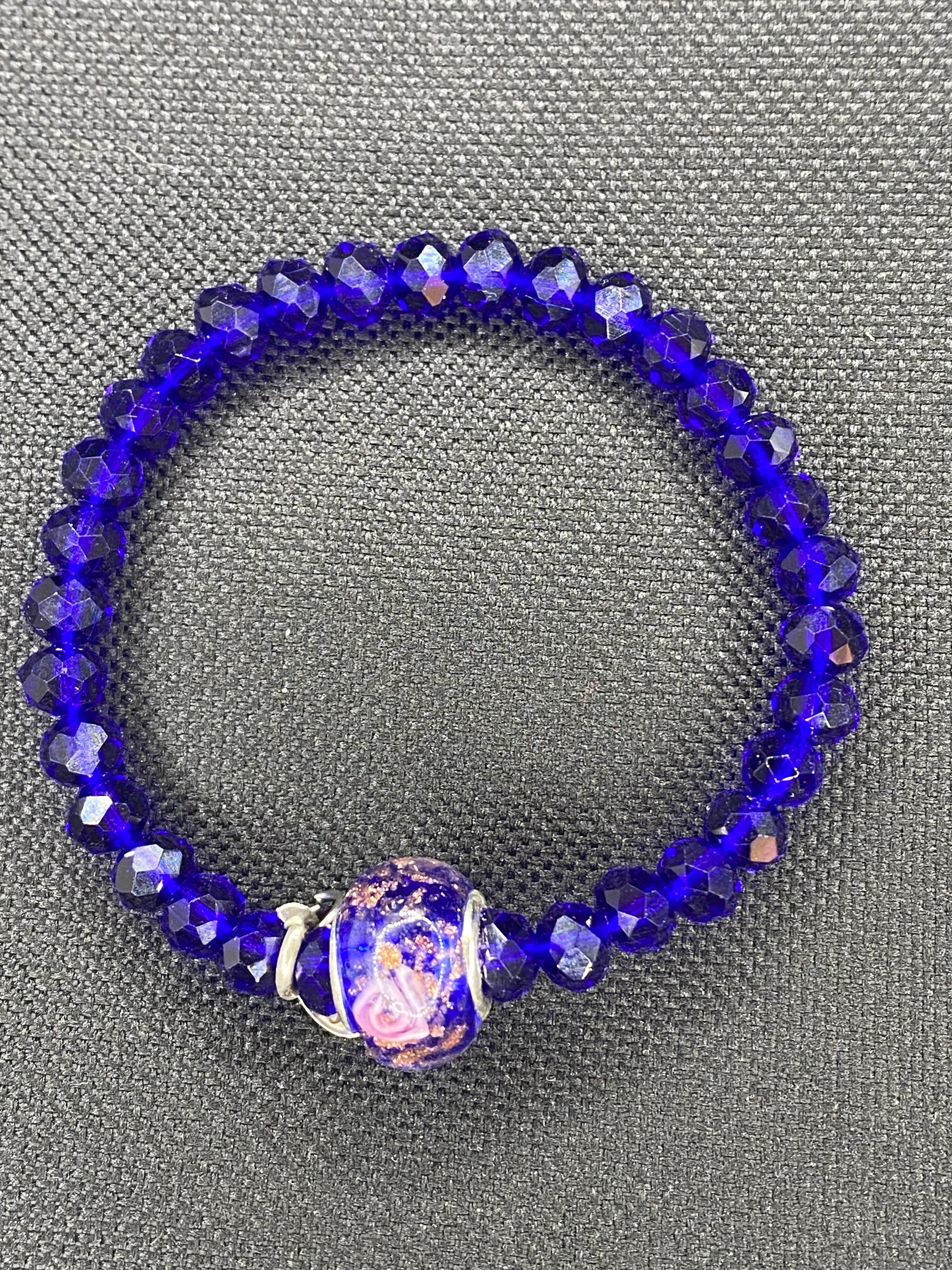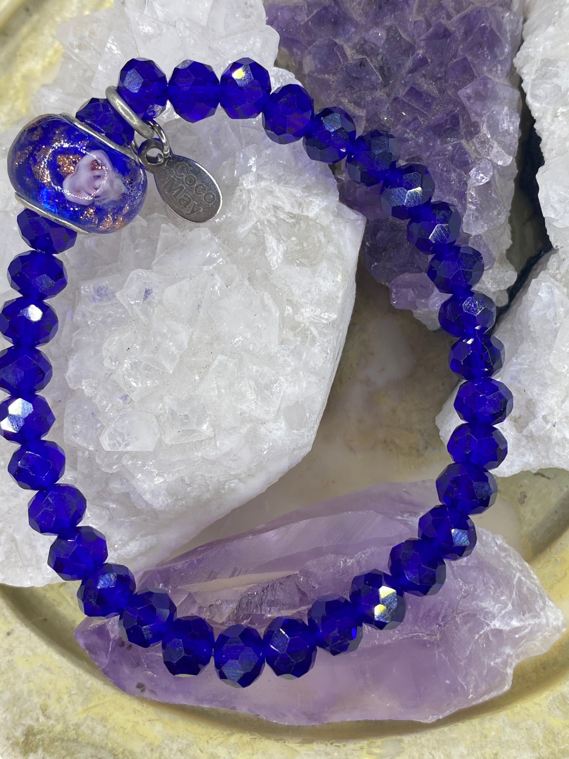 - Faceted cobalt Czech crystals, Murano glass focal bead, stretch bracelet.